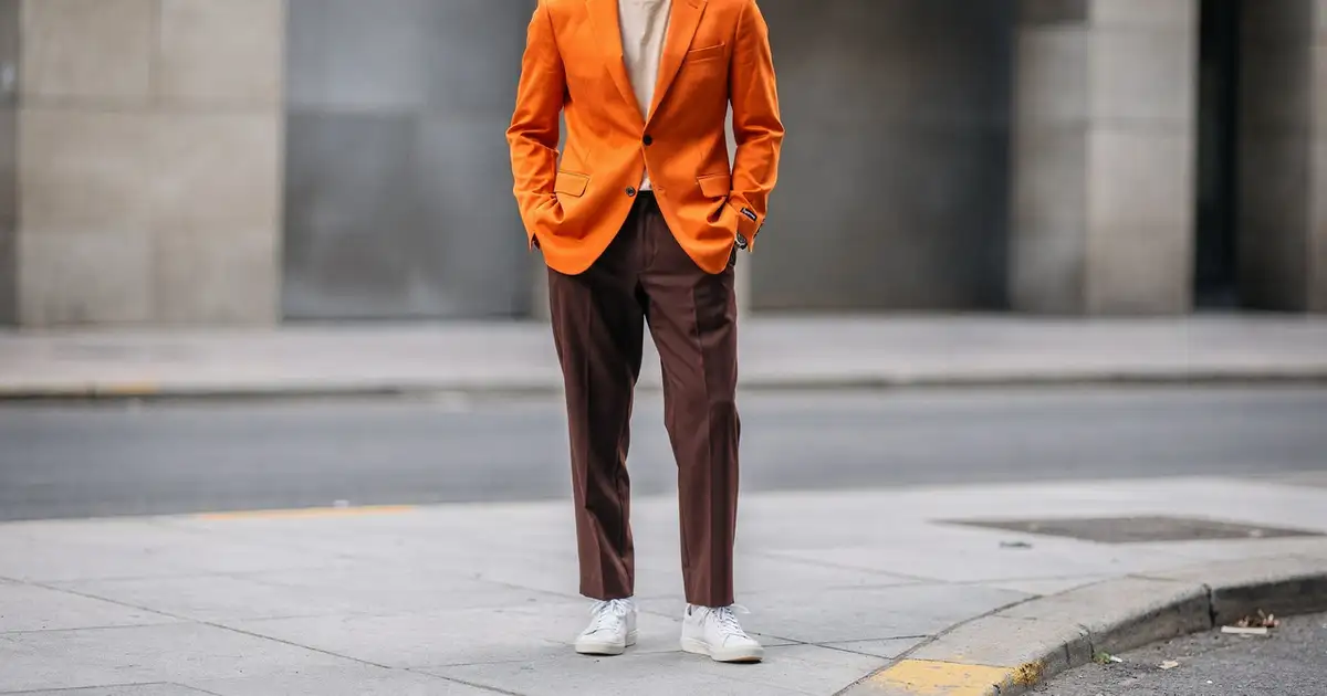2. Blazer de impacto: Sobre peças em bege, cinza ou off-white, o blazer alaranjado atualiza o look de escritório mantendo formalidade.